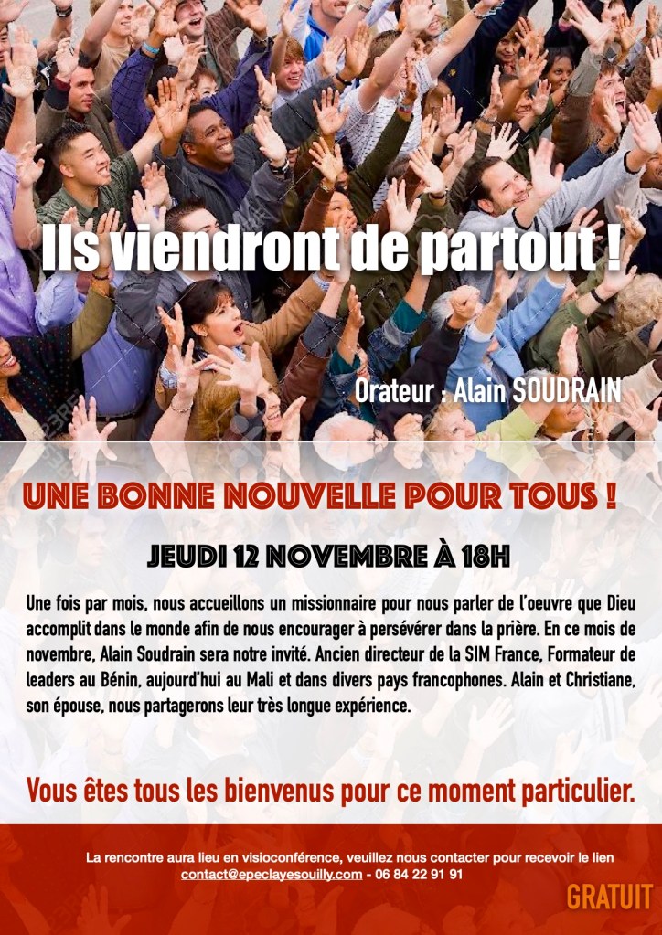 Une fois par mois, nous accueillons un missionnaire pour nous parler de l’oeuvre que Dieu accomplit dans le monde afin de nous encourager à persévérer dans la prière. En ce mois de novembre, Alain Soudrain sera notre invité. Ancien directeur de la SIM France, Formateur de leaders au Bénin, aujourd’hui au Mali et dans divers pays francophones. Alain et Christiane, son épouse, vont vous partager leur très longue expérience.