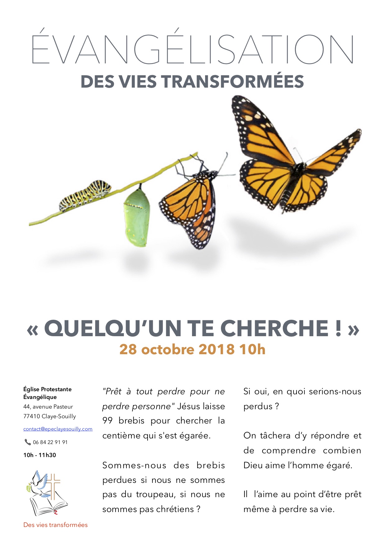 Jésus dit : « Je donne ma vie pour mes brebis ». Voici l’une des nombreuses déclarations de Jésus où Il évoque à l’avance sa mort sur la croix comme substitut pour les pécheurs que nous serions. 2000 ans sont passés et ces paroles de Jésus résonnent toujours avec autant de puissance, de force transformatrice et d’amour. LireLire la suite « Des vies transformées… »