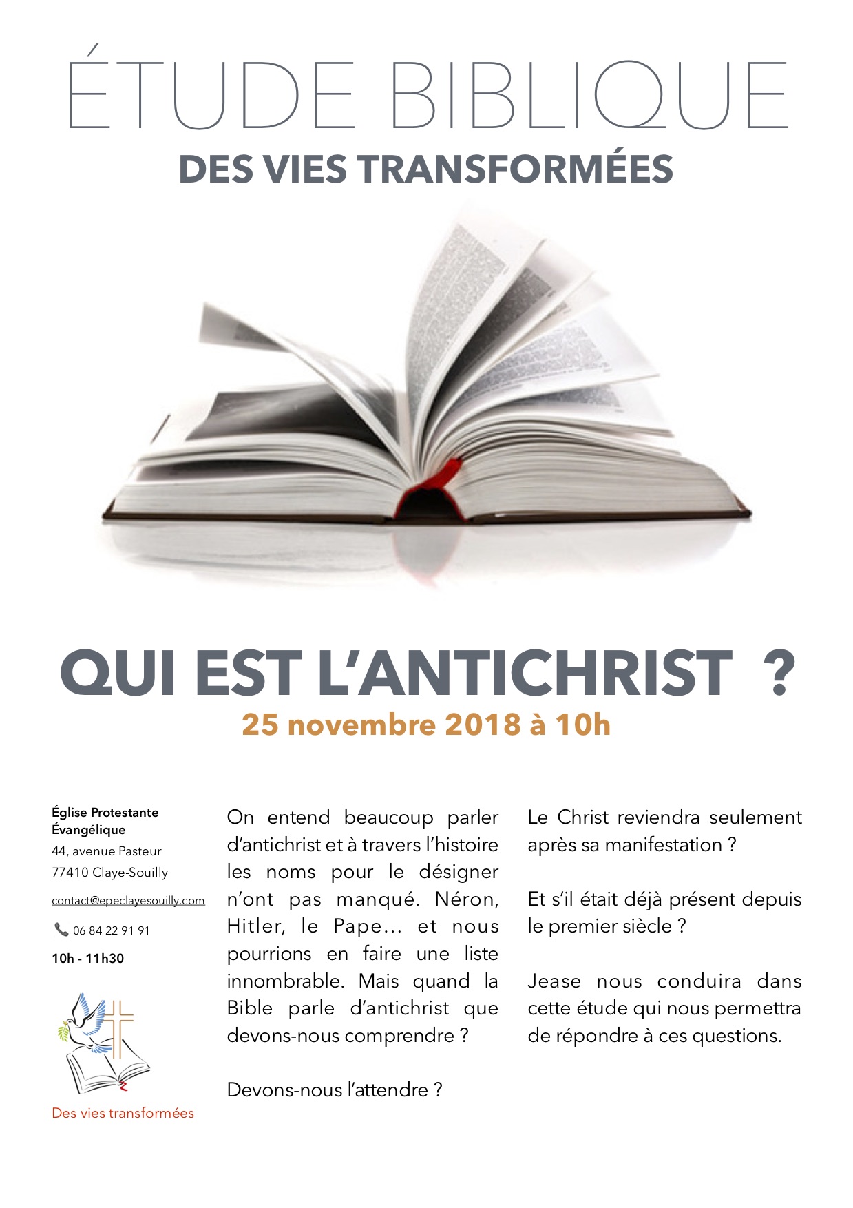 On entend beaucoup parler d’antichrist et à travers l’histoire les noms pour le désigner n’ont pas manqué. Néron, Hitler, le Pape… et nous pourrions en faire une liste innombrable. Mais quand la Bible parle d’antichrist que devons-nous comprendre ? Devons-nous l’attendre ? Le Christ reviendra seulement après sa manifestation ? Et s’il était déjà présent depuis leLireLire la suite « Qui est l’antichrist »